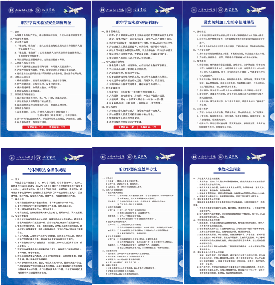 寒假期间,上海电机学院航空学院紧抓假期“黄金建设期”,以制度完善、安全筑牢、能力提升为核心,系统推进实验室规范化建设各项工作,实现假期工作“不打烊”、建设进度“不停步”,为学院教学科研高质量发展与航空特色人才培养夯实基础。安全制度全覆盖,筑牢实验室安全防线学院实验室中心针对航空制造与运维实验室、飞机钣铆实验室、航模创新实验室等11个不同功能的实验室,结合各实验室设备特性与潜在风险,精准制定实验室安全管理和使用规范、仪器设备操作规程、危险化学品管理办法、应急处置流程等安全管理制度28项。同时,精心制作包含基本管理规定、专项设备操作标准、应急处理流程等核心内容的安全操作规程展板60余块,明确激光切
