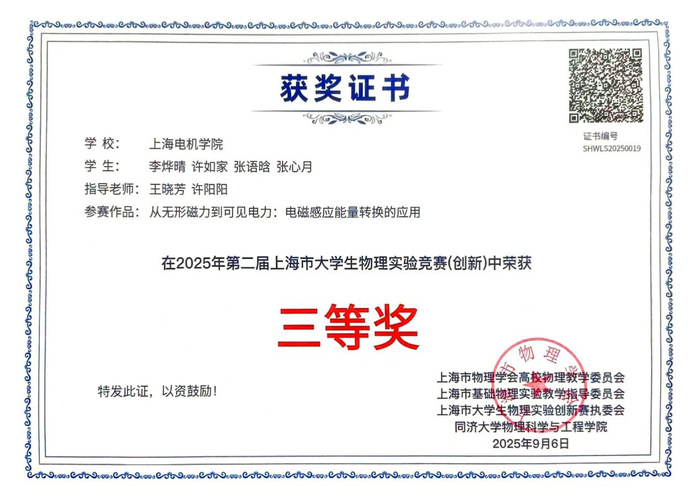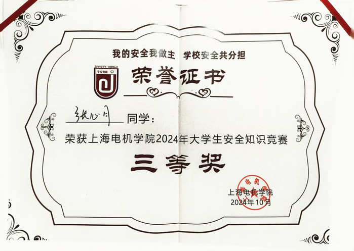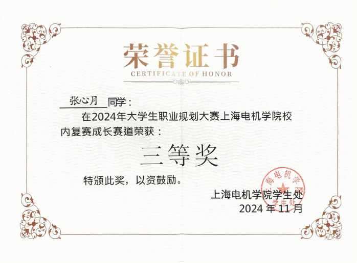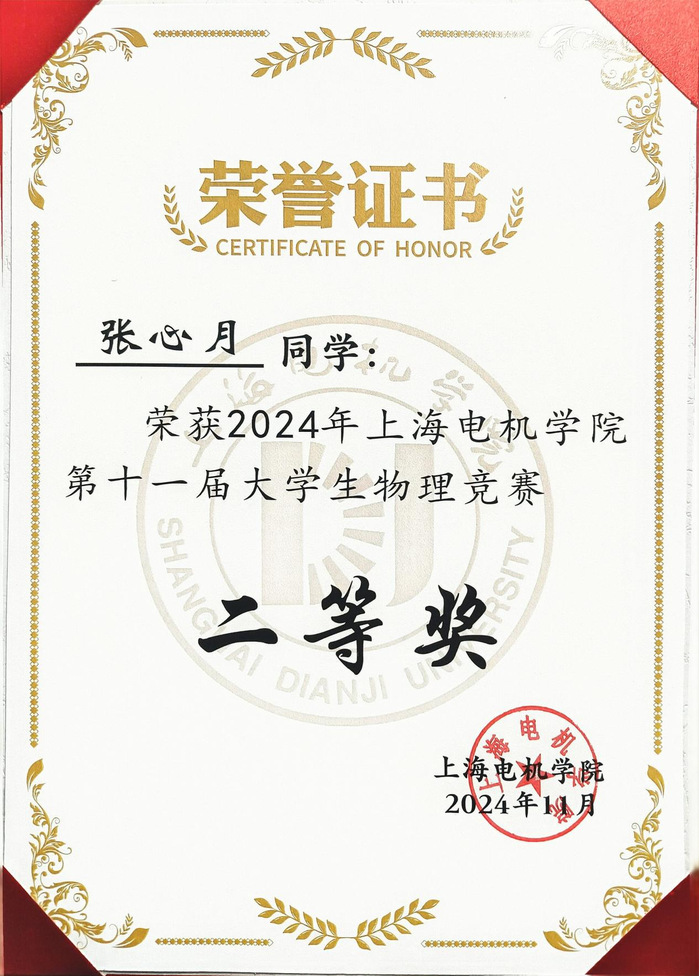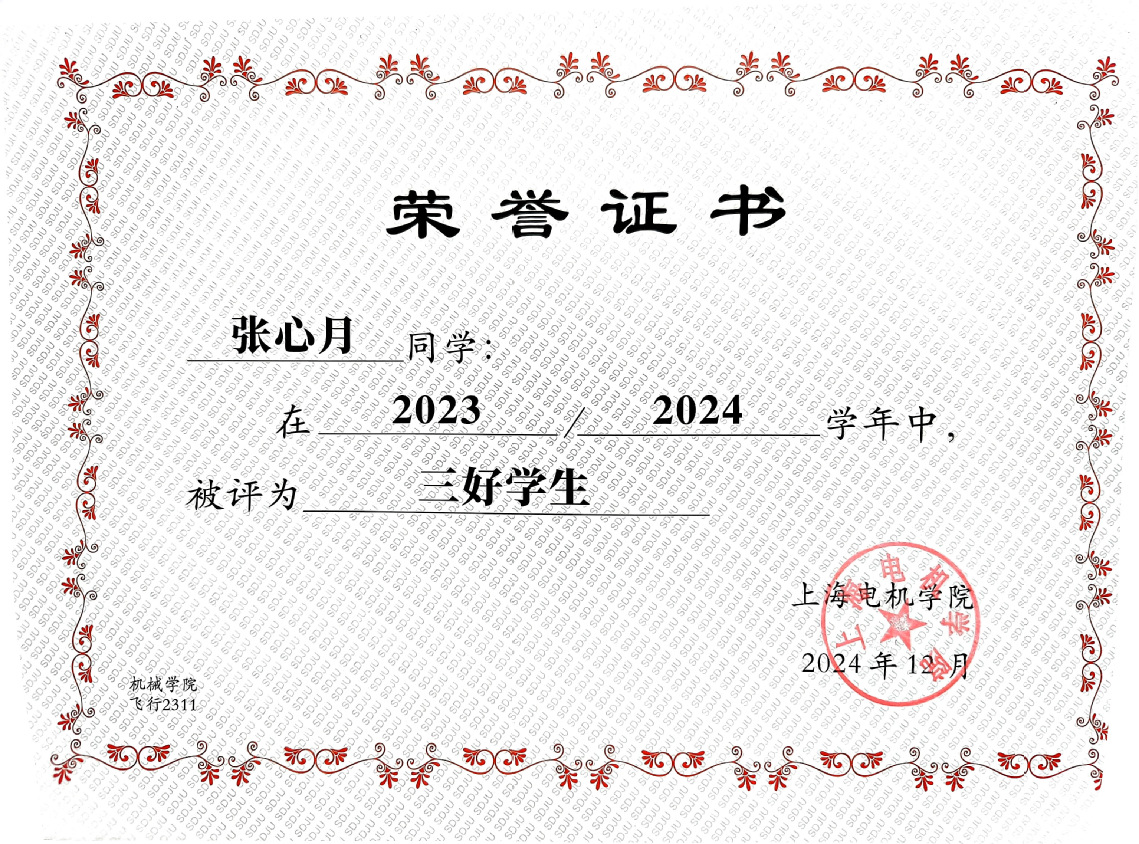 在专业学习方面,张心月始终秉持“立学勤为先”的信念,绩点排名专业第一,荣获学业特等、一等奖学金。同时注重技能复合化培养,不仅顺利通过英语四六级和计算机二级考试,更掌握UG,CATIA等专业软件,考取CAD证书。学科竞赛是检验学习成效的重要战场,她曾获得大学生物理竞赛二等奖,外教社杯英语演讲比赛校级三等奖,向上杯英语竞赛一等奖,大学生物理实验竞赛二等奖。在科技创新方面,她积极投身于内核的探索,荣获“挑战杯”上海市一等奖,中国机器人及人工智能大赛国赛三等奖,无人机创新训练营获良好营员称号。